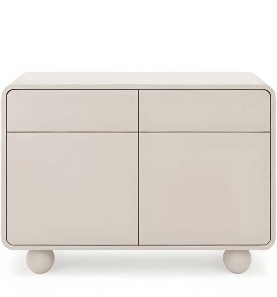 - System Push-to-Open: Brak wystających uchwytów podkreśla minimalistyczną formę mebla i zwiększa bezpieczeństwo w strefie gier i zabaw.