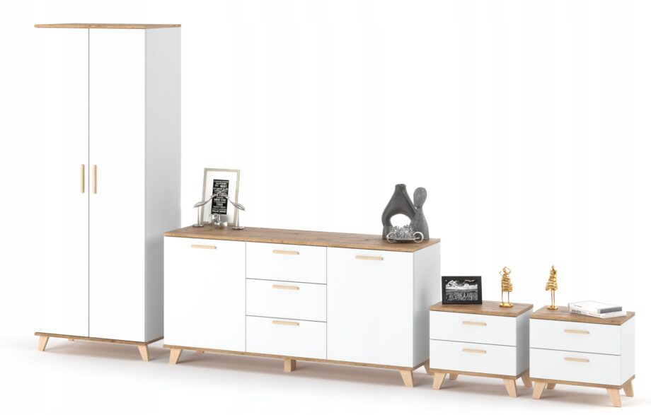 - Kompletny Zestaw 4 w 1: W skład systemu wchodzi pojemna szafa dwudrzwiowa, szeroka komoda z szufladami i szafkami oraz dwie szafki nocne z podwójnymi szufladami.